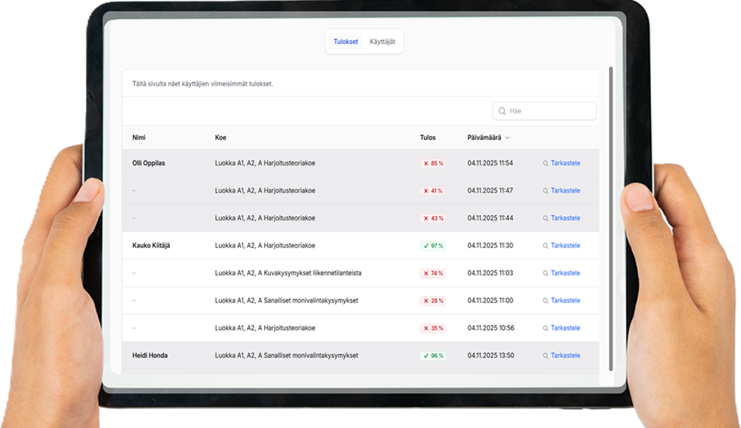 Tilastojen mukaan huolellinen valmistautuminen on avain läpäisyyn, olipa kyseessä perusteoria tai vaativa ammattitutkinto. Kattavalla harjoittelulla varmistat, että kuulut onnistujien joukkoon. Ympäristömme toimii puhelimella, tabletilla ja tietokoneella.