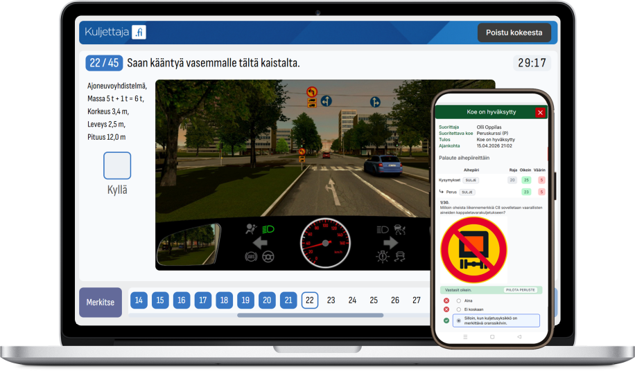 Kattavalla harjoittelulla varmistat, että kuulut onnistujien joukkoon heti ensimmäisellä yrittämällä. Harjoitukset ovat suomeksi, ruotsiksi ja englanniksi – millä tahansa laitteella.